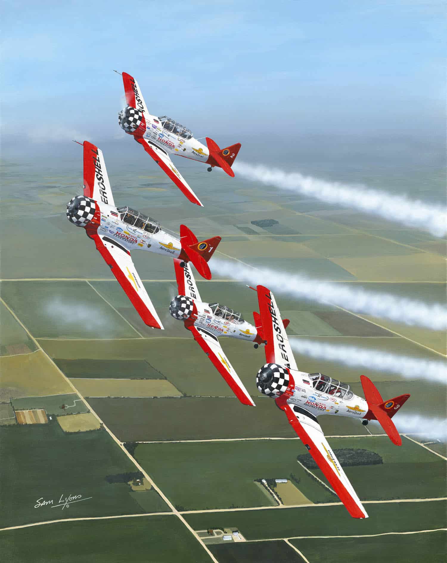 How do you capture the excitement of the AeroShell Aerobatic Team on paper? It’s not easy, but Sam manages to make these four AT-6 Texans come to life. The aircraft, manned by highly skilled pilots, are zooming across the sky in a diamond formation on their way to a slow roll. The original painting was commissioned by Eastern Aviation Fuels, the nationwide distributor for Shell aviation products.